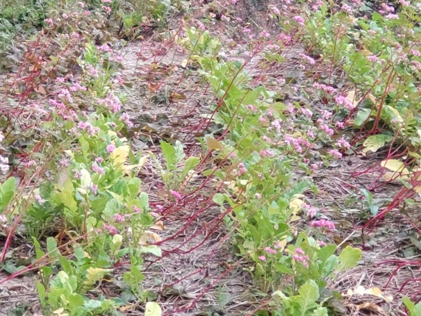 コスモスの花は満開にはなりませんでしたが、試しに植えたそばは可憐な花が咲いて、11月中旬以降も赤い花を見せてくれていました。そばは日の光が少なくても育つ、花は長く咲く!ということを経験から学びました。来年はコスモスを断念して、そばを多く蒔こうと考えています。ちなみにそばの花粉にはアレルギーを引き起こす抗原はないので、そばアレルギーの人でもそばの花は間近で見ることができます。そばの実(種)を口に入れなければ大丈夫です。
