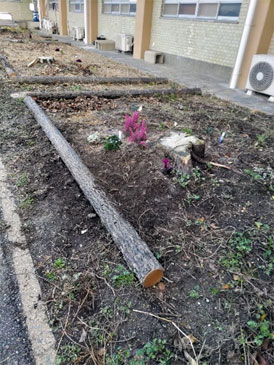 一見普通の木のようにみえる、丸太みたいなコンクリを運び、花壇の枠が完成しました。いかがでしょうか?